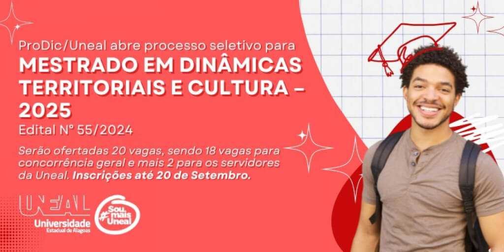O curso de mestrado do Programa de Pós-Graduação stricto sensu em Dinâmicas Territoriais e Cultura da Universidade Estadual de Alagoas (ProDiC-Uneal) está com inscrições abertas, de 26 de agosto a 20 de setembro, para o processo seletivo de novos estudantes para o primeiro semestre do ano letivo de 2025.
